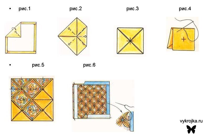 Наживите края основного большого квадрата на 1 см, углы квадрата согните к центру и закрепите иголкой рис.1 Появившиеся углы снова согните в центр, чтобы их вершины совпали рис.2. Закрепите углы получившегося основного конверта, затем удалите иголки из ткани рис.3. Сделайте заготовки из оставшихся 15 квадратов. Сложите их лицом друг к другу и сшейте конверты в полотно по 4 конверта рис.4. Приколите иголкой атласные квадратики в соединительные швы сшитых конвертов рис.5. Дальше делаем лепесточки нашего цветка, для этого закрепив большим пальцем руки, отгибаем края конвертика на атласный квадратик и пришиваем его. Итак далее каждый лепесток рис.6. Пришиваем оборотную сторону наволочки.