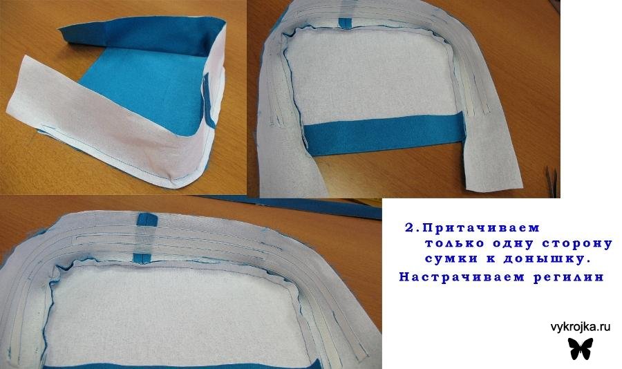Пришиваем только одну сторону сумки к донышку и настрачиваем полоски ригилина.